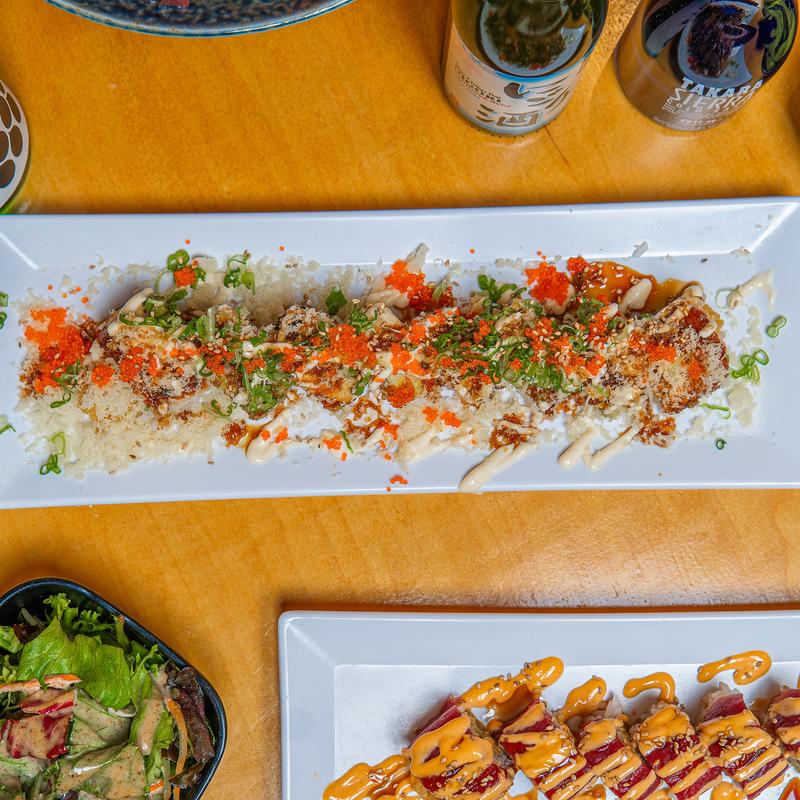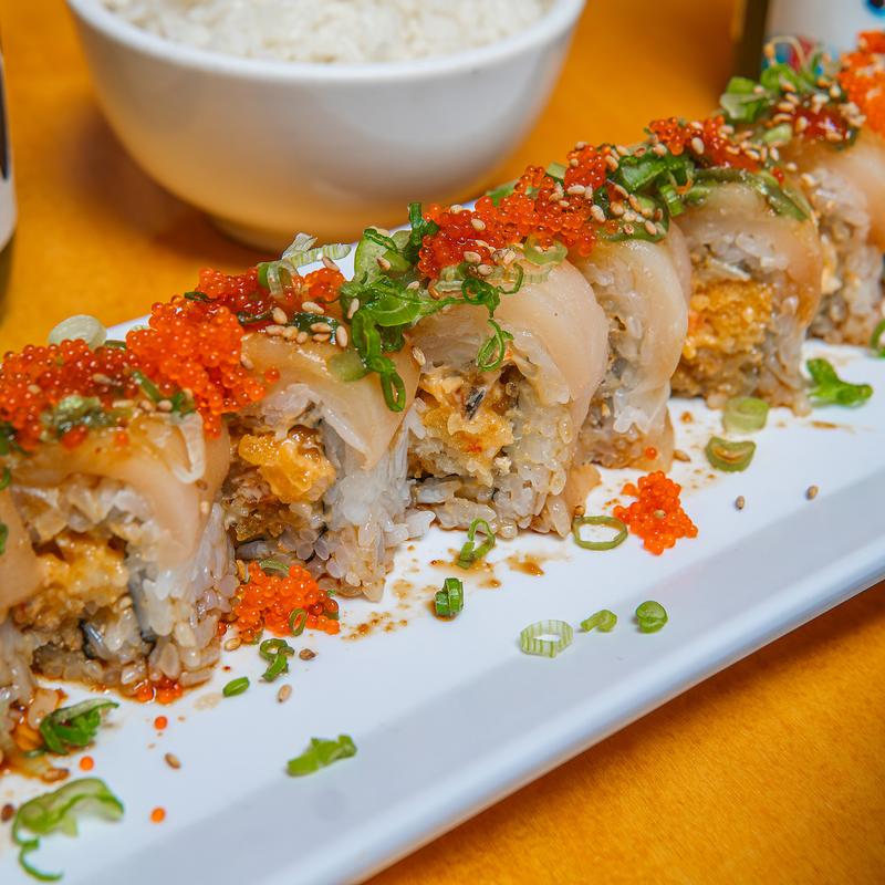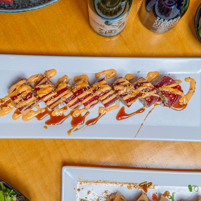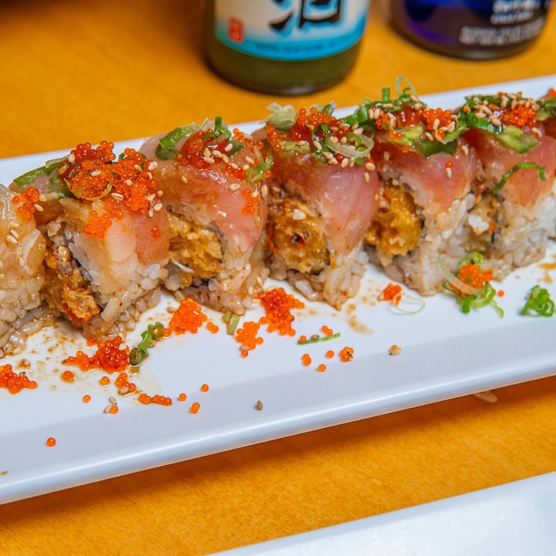 Shrimp tempura & snow crab inside, spicy tuna, unagi, tempura flakes on top with spicy house sauce