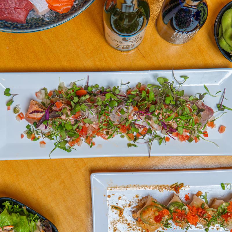 Spicy tuna and shrimp tempura inside with seared sake, maguro, and hamachi on top. served with yuzu pico de gallo, micro greens, and micro cilantro