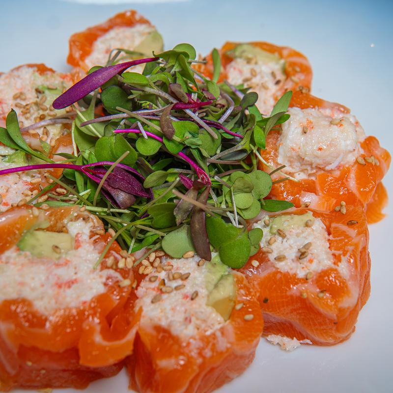 Snow crab and avocado wrapped in salmon. Served with lemon zest dressing
